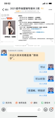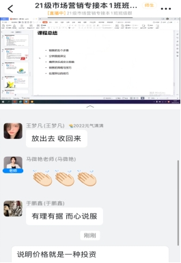 本节授课内容包括推销洽谈的程序、推销洽谈的策略、推销洽谈的技巧等。马老师一直保持了和学生们良好的互动。内容如下: