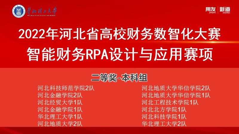 本次大赛由河北省教育厅主办,由华北理工大学、新道科技股份有限公司联合承办。智能财务RPA设计与应用赛项以“新道云”作为平台。充分结合财务会计类专业学生的认知和学习特点,将智能机器人设计与应用知识点全部案例化、任务化。以竞赛方式让学生在案例实操中,结合当下最新的“财务数字化”理念,通过“流程变革+应用设计”的考核方式,培养财会专业学生的流程优化思维与RPA设计与应用能力,以及借助智多星工具发现、分析与解决企业财务管理问题的能力,促进团队成员间的沟通协作能力,是学生展示财务智能化能力的舞台。