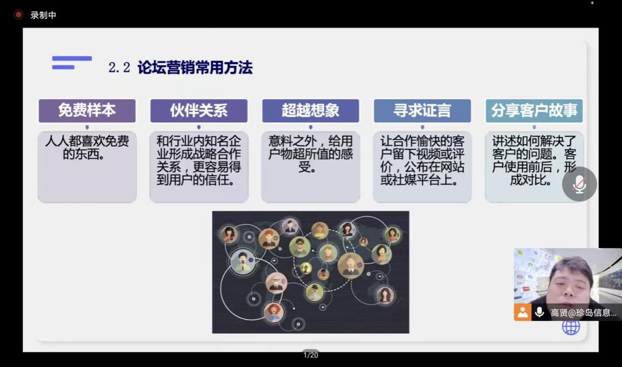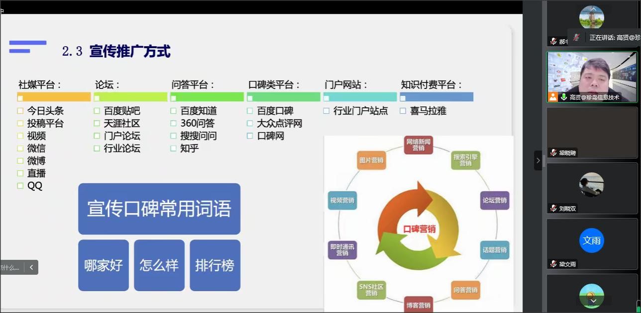 首先,高贤老师向同学们展示了网络知识平台,论坛营销的常用方法以及故事式软文写作要点,详细讲解了网络口碑传播,口碑传播分类、网络口碑平台(微信、微博、豆瓣、小红书、抖音、快手、大众点评网、行业门户网站、论坛),利用案例给我们讲解了网络论坛营销推广的方法及问答推广实战。同学们掌握扎实理论知识,之后再运用到实际操作中。