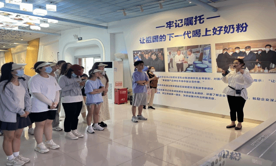其次,学生们参观君乐宝奶牛科普馆和挤奶大厅,奶牛科普馆集奶牛互动区、环幕影院、产品互动等区域于一体,完整呈现了世界奶业发展史及现代化奶牛养殖的相关知识和技术。学生们见证了从饲喂、挤奶、到生产的全方位的过程,优质牧场使学生们近距离接触现代养殖业。