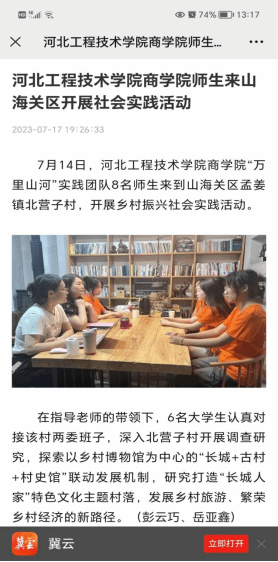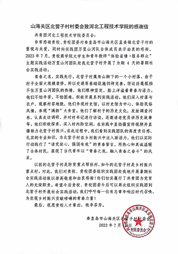 此次实践活动得到北营子村村书记及其他村干部的大力支持和感谢,特为暑期社会实践万里山河队写了一封感谢信,并且还被翼云客户端、山海关区融媒体相继报道。
