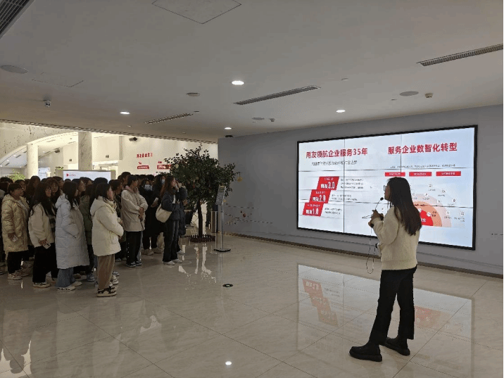 此次认知实习分为两个部分。首先,实习团队参观了用友企业展厅,展厅内陈列着用友企业的研发成果和技术应用案例。师生们通过实物展示和多媒体介绍,深入了解了用友企业在软件开发、云计算、人工智能等领域的创新成果。在引领数字化转型的背景下,用友企业为各行各业提供了智能化的解决方案,为社会发展做出了积极贡献。