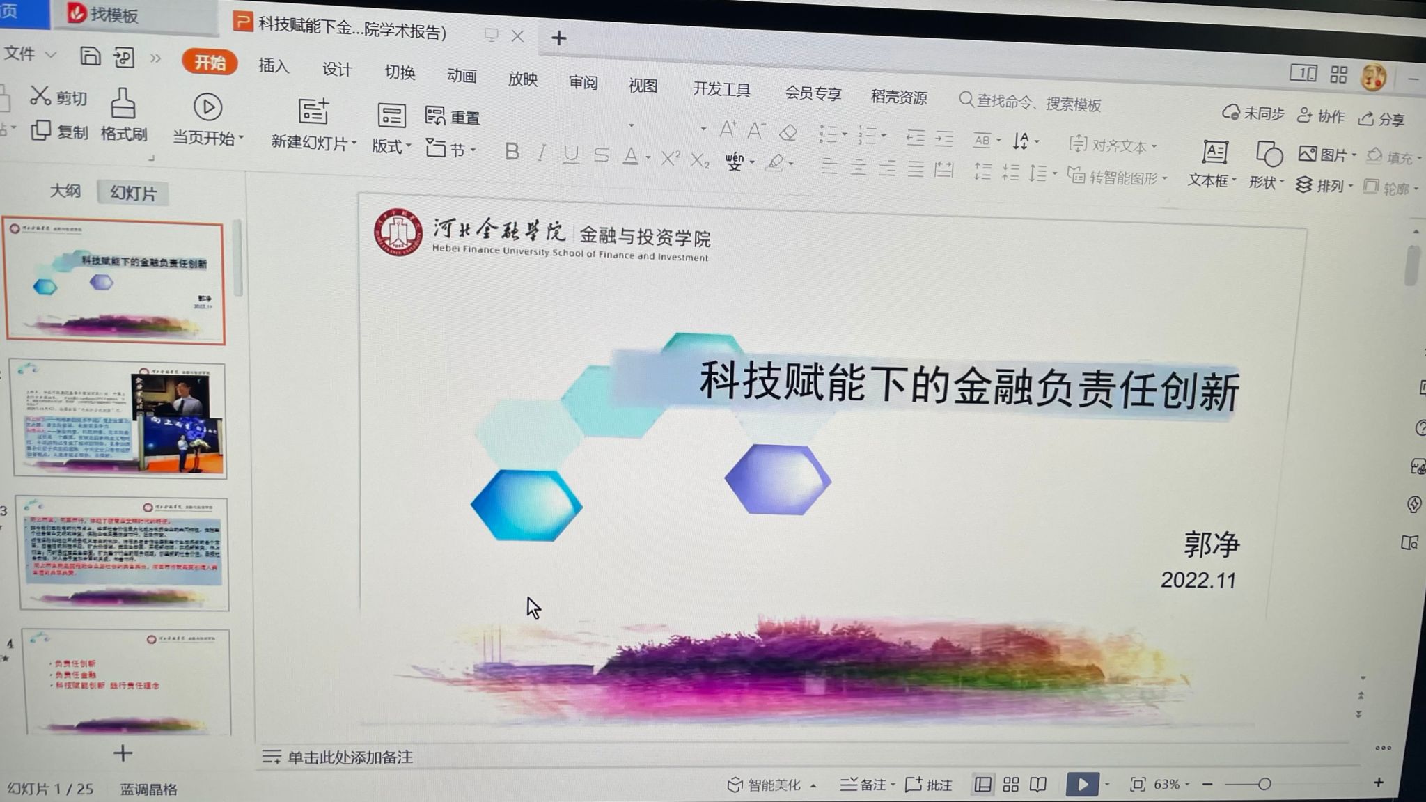 为进一步营造学院和我系的学术氛围,引导学生关注金融业界的前沿和热点问题,激发学生学习专业知识的热情2022年11月25下午3:30-5:00金融工程系特邀河北金融学院金融与投资学院院长郭净教授,为本系全体师生,做了一场题为“科技赋能下的金融负责任创新”的学术报告。