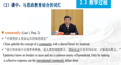 本节课的课程思政设计围绕社会主义核心价值观的思政主题,运用多模态语言素材。教师围绕本节课课文相关词汇,提供有价值引领的例句作为教学内容,优化了内容供给;通过增加中国文化内容实现中西文化并存;通过教学内容二次开发,提炼、凸显思政元素;重构练习内容,巩固思政效应。让学生明确中国青年的态度与责任,讲好中国故事,传递中国声音。在中外思想碰撞中,提升文化自信及文明互鉴意识。