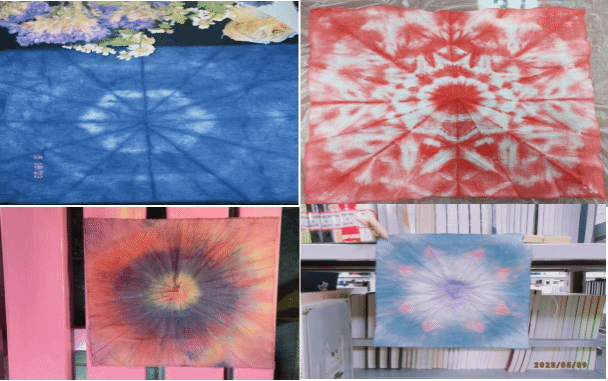 首先,由工作人员播放扎染视频,供学生们观赏学习;其次由工作人员分发扎染的工具(方巾、颜料、围裙、手套、弹珠、雪糕棒、模板、皮筋等小物件);然后在场同学们按照视频的讲解指导,充分发挥自己的想象,把弹珠、勺子、雪糕棒等小物件包进方巾,然后用皮筋、麻绳扎起来,遵循浸泡程序,经过1个小时的动手体验,一幅幅精美的扎染作品呈现在眼前。最后大家将自己作品互相展示和探讨,活动现场呈现出一副和谐、温馨的画面,每个人脸上都洋溢着自信和幸福的笑容。