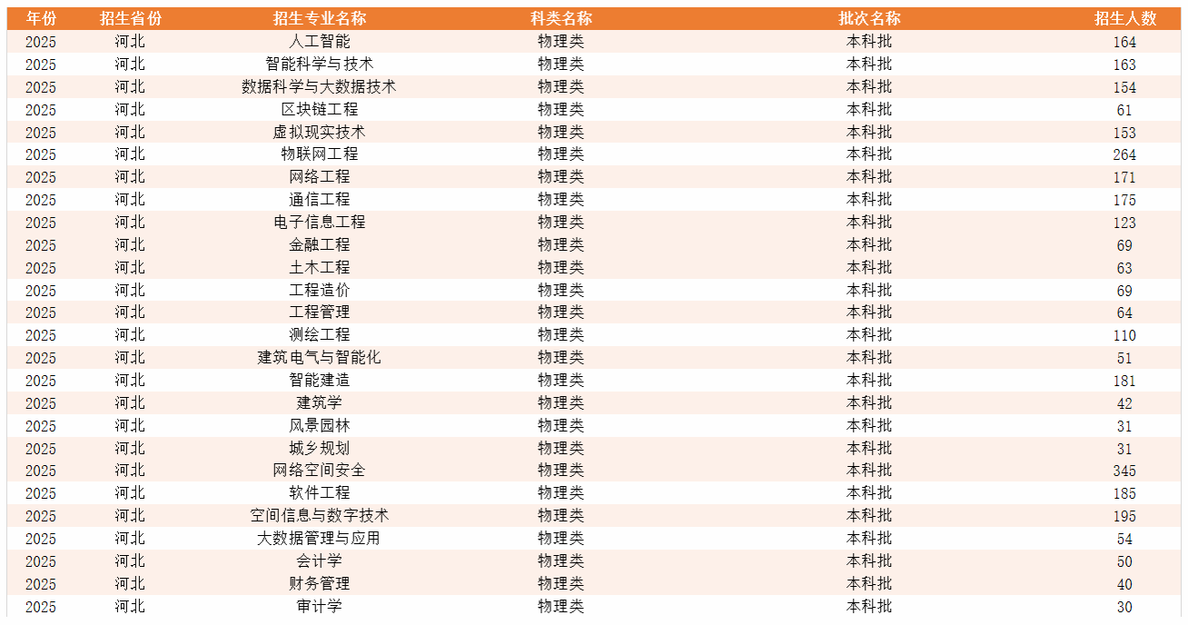 学校立足河北,面向京津冀,辐射全国,主动适应区域社会经济发展需要,形成了以工学为主,多学科专业交叉融合、相互支撑、协调发展的学科专业体系。设有网络空间安全学院、人工智能学院、土木与建筑学院、十大买球的正规网站、艺术与传媒学院5个二级学院。