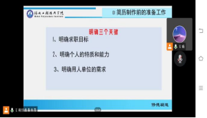 王琦老师首先从简历主要作用和在求职过程中的重要性进行讲解引起同学们对制作一份优秀简历重要性高度重视接着王老师从简历制作前的准备、简历的内容、简历的形式、简历制作的技巧与注意事项和简历的投递五个部分进行了详细的讲解。
