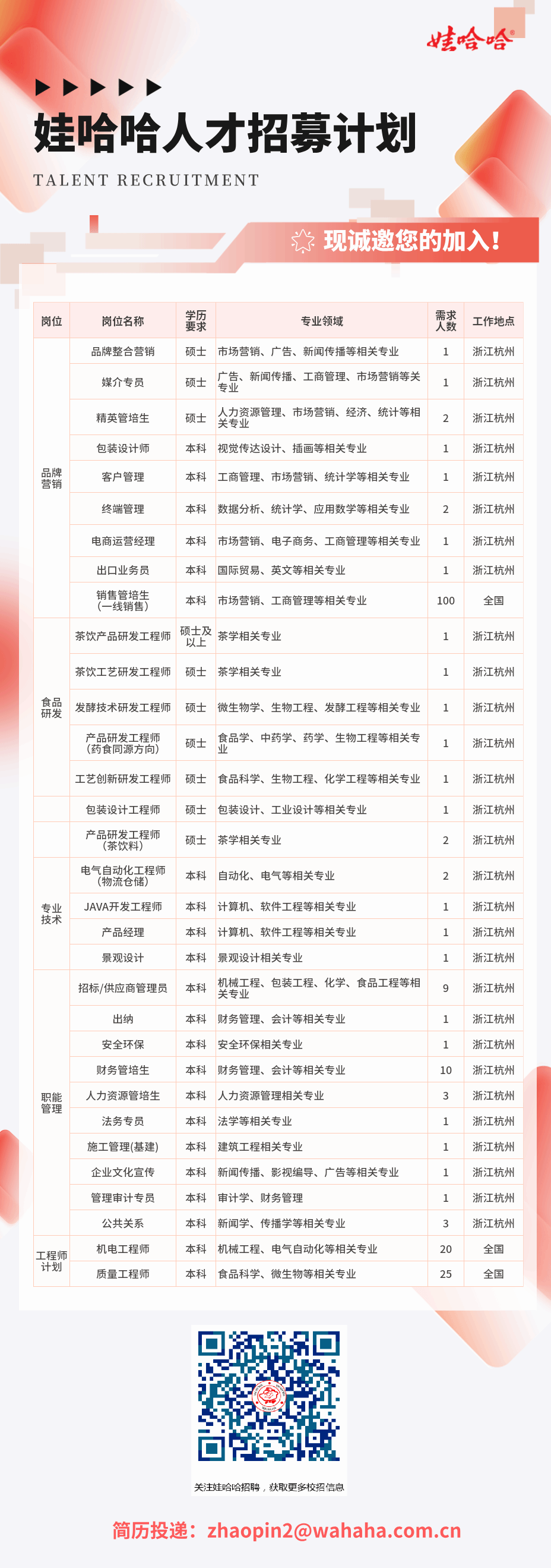 娃哈哈集团2025年春季招聘