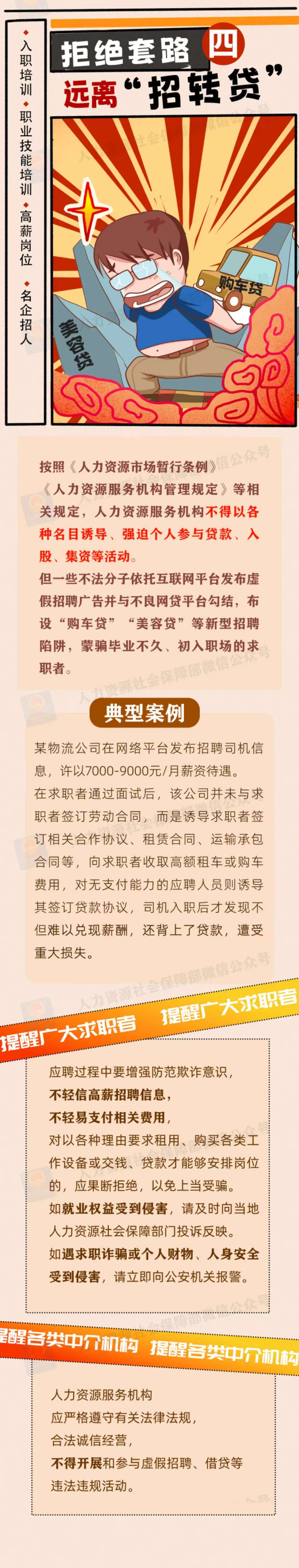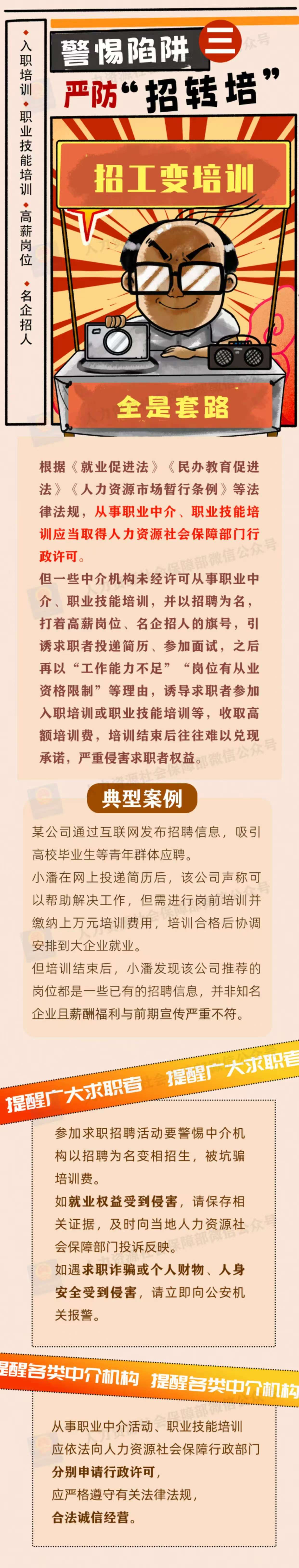 为加强风险防范,人力资源社会保障部、中央网信办、 教育部联合发布招聘欺诈典型案例,揭示不法分子的惯用手法和话术套路,帮助高校毕业生等广大求职者提高风险识别意识,增强自我保护能力。