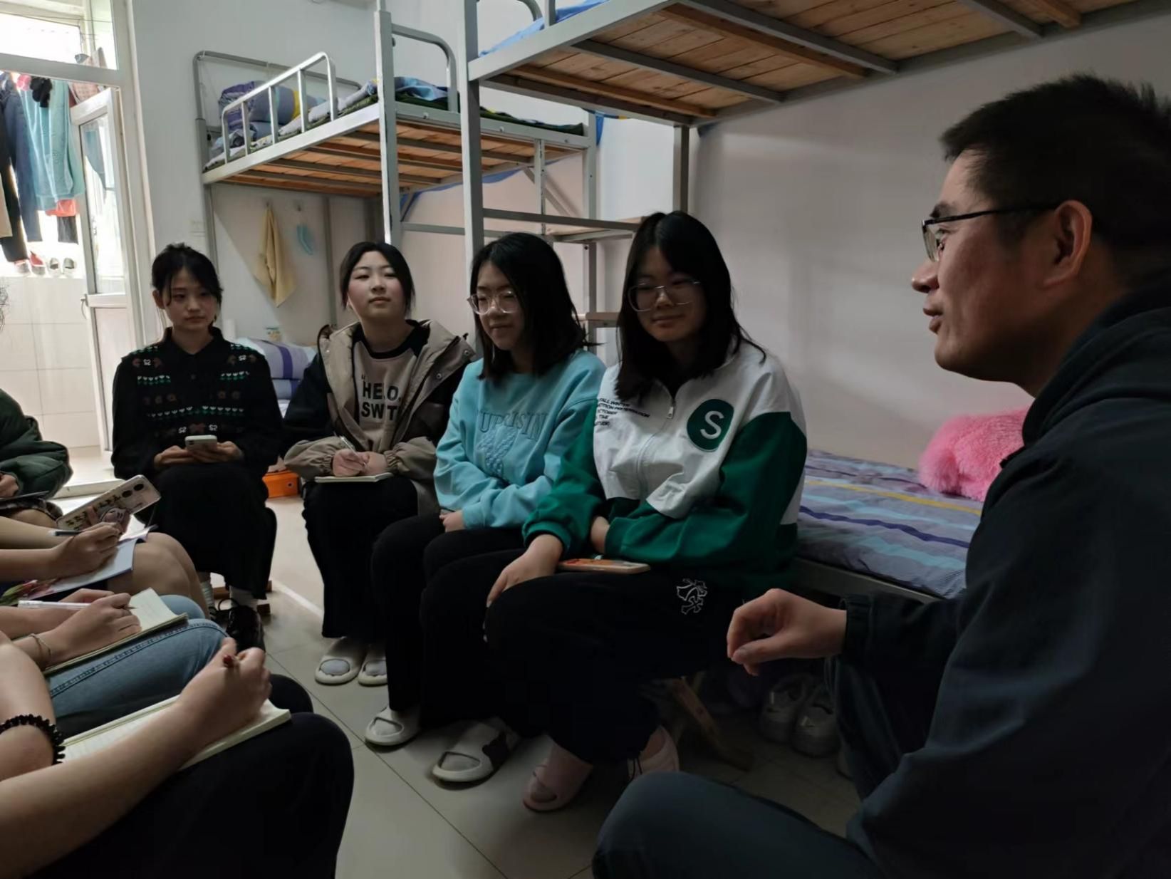首先,徐伟科老师作为主持人,以二号楼259宿舍为主要场所,对学生讲解宿舍是大学生日常生活与学习的重要场所,是育人环境中最基本的元素,是开展大学生素质教育和思想政治工作的重要阵地。大学生1/3的时间都在宿舍,因此今天利用周末的时间开一次民主生活会。第二部分由学生提问,导员回答方式开展,每名学生都对自身进行了总结与反思,针对学习与生活中遇到的问题进行了提问。提出了“综合测评中到梦空间分数的问题”,“志愿活动名额是由导员安排还是社团安排?”奖助学金评比等问题,生活上宿舍空间利用不均匀等问题,徐伟科老师一一认真耐心解疑答惑,赢得学生好评。