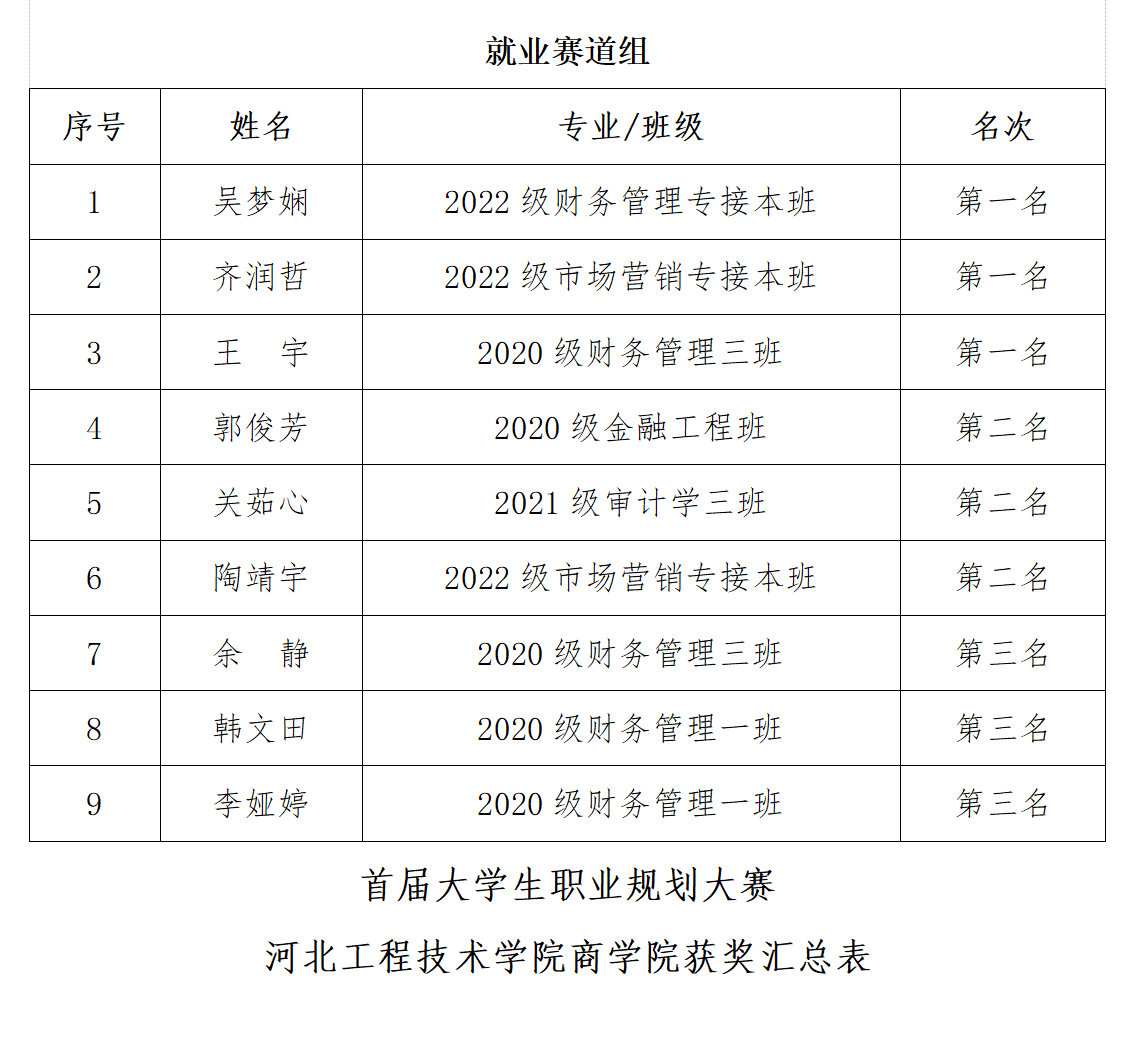 周密筹划,确保大赛有序实施。按照学院工作部署,招生就业办公室科学筹划,精心拟制《关于组织大学生职业生涯规划大赛的通知》,研究确定“商路未来,规划职程”大赛主题,并明确比赛时间、参赛作品要求、活动安排和评比规则等,统一规范复赛推荐表和职业生涯规划书格式标准,全力确保大赛有序组织实施。