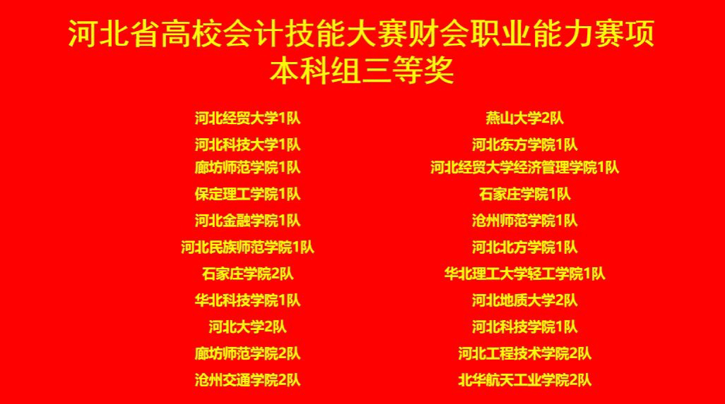2024年10月19日,由河北省教育厅主办,河北地质大学承办的2024年河北省高校会计技能大赛财会职业能力赛项圆满落幕。此次大赛吸引了来自全省多所高校的会计学专业优秀学子,共同角逐财会职业能力的巅峰荣耀。十大买球官网十大买球的正规网站由万月和边圆围老师带领的两支队伍,一队吴朝臣、纪泽峰、庞海姣、孙文慧和二队王苗苗、王若萌、李敏、李玉婷分别获得了省二等奖和三等奖的优异成绩!