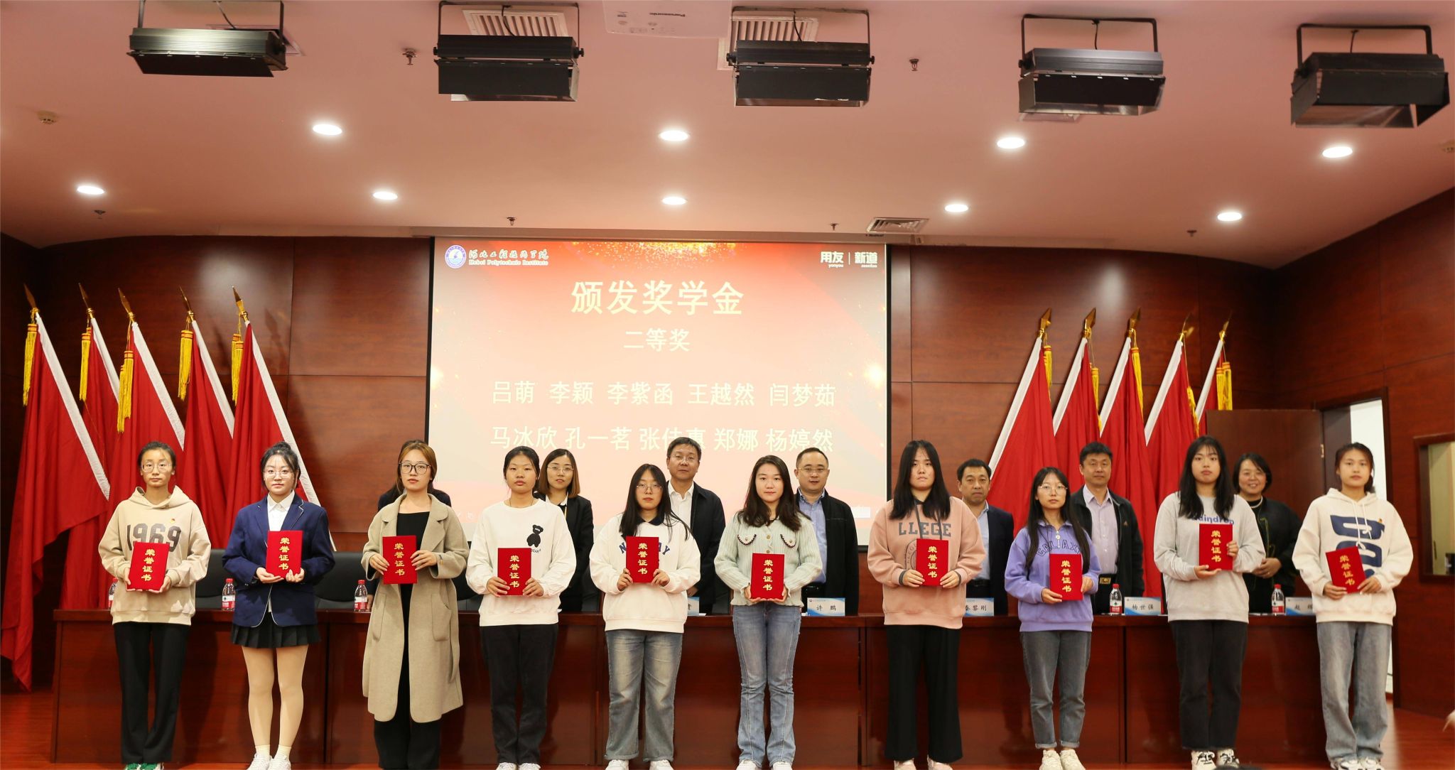 最后,与会领导为数智财经产业学院2022级新道班学生颁发“2022—2023学年用友新道数智财经产业学院综合奖学金”,并对获奖同学表示祝贺。