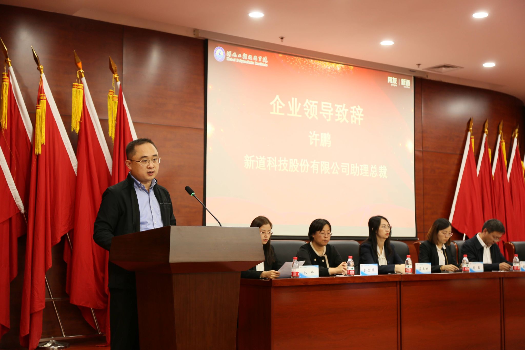 新道科技股份有限公司助理总裁许鹏发表致辞,许总表示新道公司作为中国领先的数智化人才培养服务商,要为高等教育和职业教育提供智能财务、数字人力、数字营销等综合教育产品与云服务解决方案,凭借先进的实践育人理念,依托用友集团超700万企业客户最新应用实践,通过数字化教育云平台,为院校构建校企合作、产教融合新范式,共建未来技术学院和现代产业学院,共同培养数智化人才,服务产业升级。